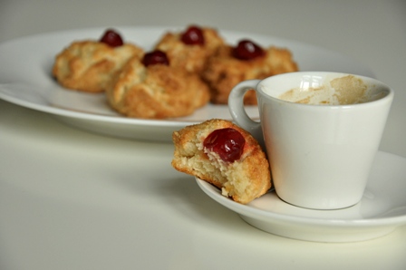 There are several versions of the recipe depending on what part of Greece you visit but almonds are always the hero ingredient. As I couldn’t find orange blossom water I modified the recipe and used rose water. I also made a few amygdalota with a couple of drips of kirsch which complemented the glace cherry.
